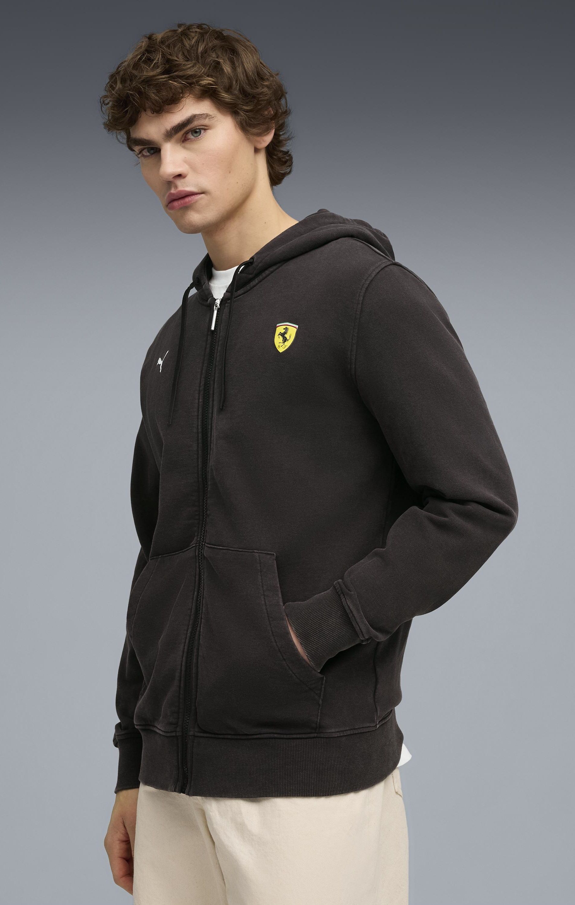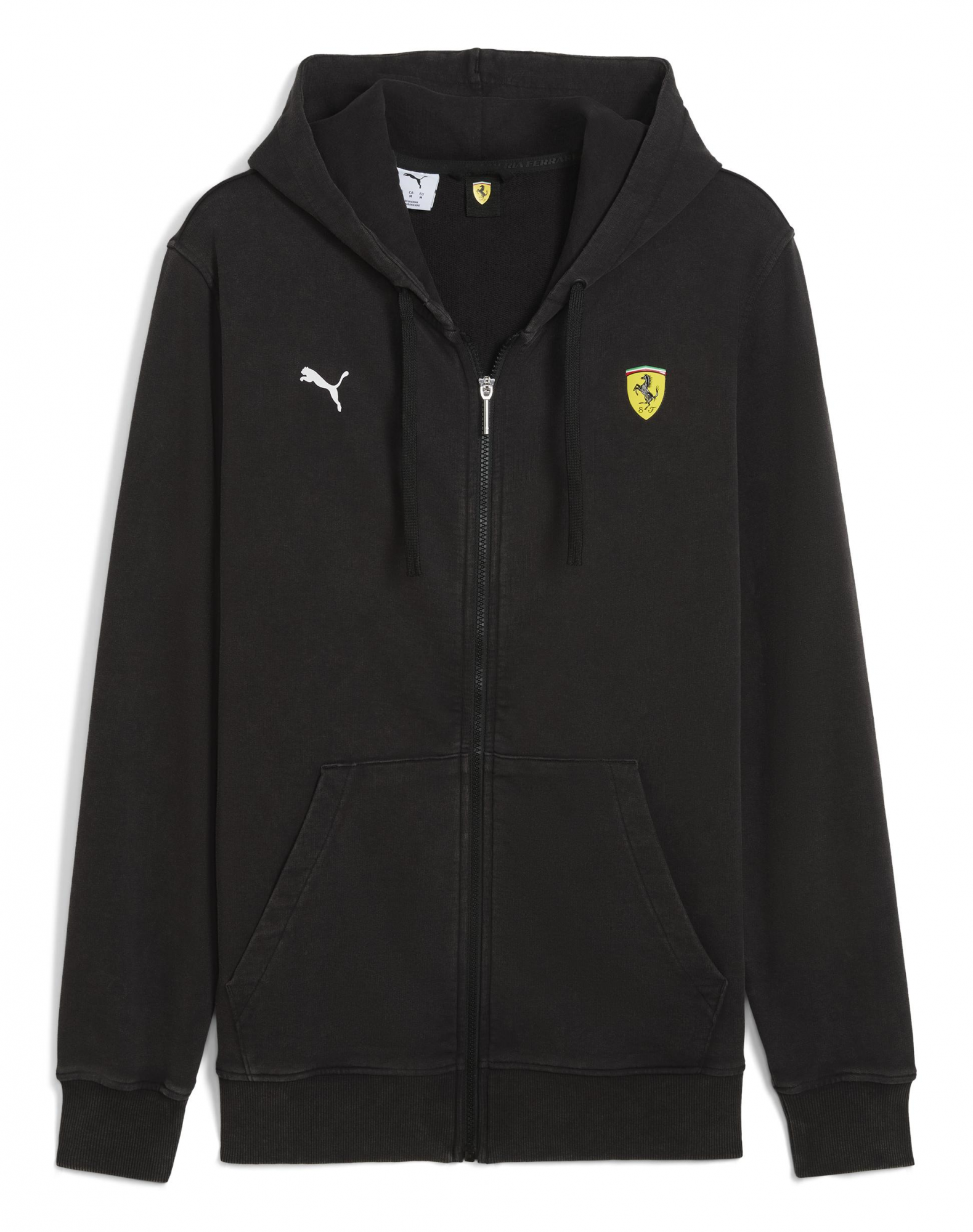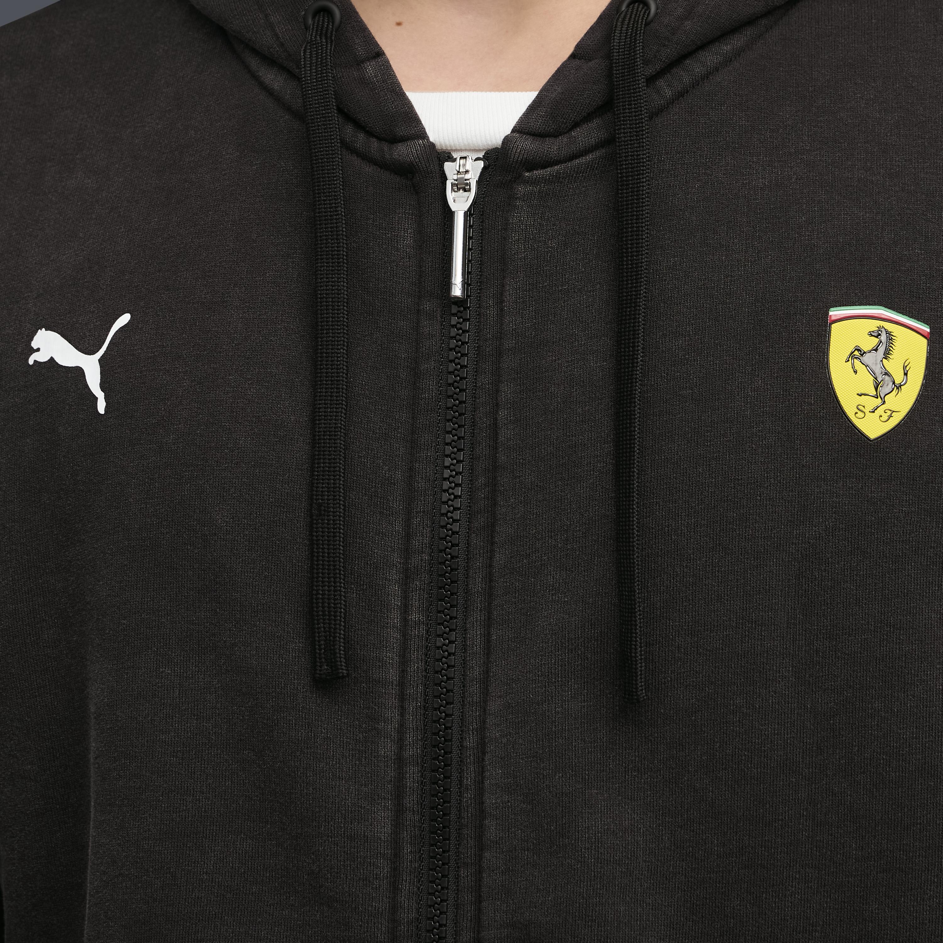 На передней части толстовки размещён фирменный логотип PUMA и эмблема Scuderia Ferrari — это не просто декор, а знак принадлежности к миру высоких скоростей и безупречного стиля.